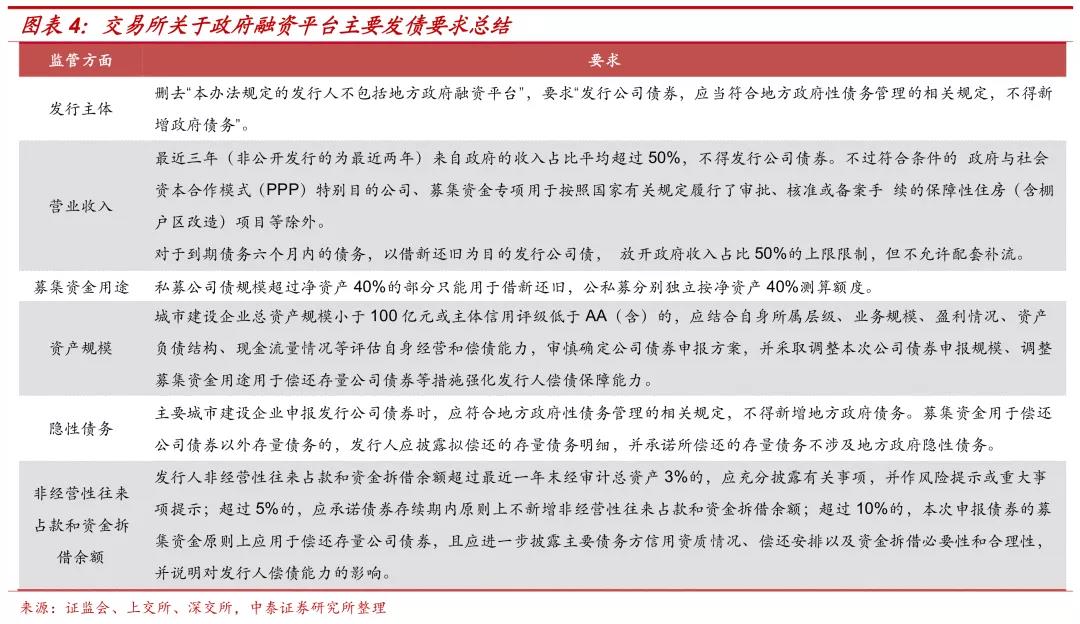43号文规定“剥离融资平台公司政府融资职能,融资平台公司不得新增政府债务”,此后一系列文件都意在推进城投公司融资与政府信用的剥离,从发债政策看,发改委、交易所以及交易商协会均通过提高城投公司发债条件,规范平台发展,督促其完成市场化转型。