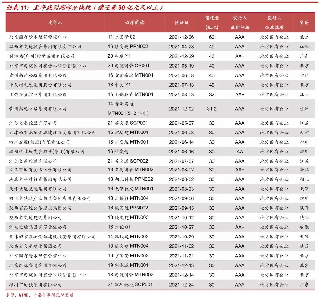 根据WIND城投债口径,我们统计了2021年4月24日至2021年12月31日之间到期及回售的城投债情况,总规模约1.76万亿元。其中,交易商协会产品[7]到期及回售规模为1.35万亿元,占比76.58%,公司债和企业债则分别占比19.42%和4%。从主体最新评级来看,至年底到期及回售的城投债中,AA及以下主体占比近18%,建议关注短期内低资质融资城投公司偿还情况。